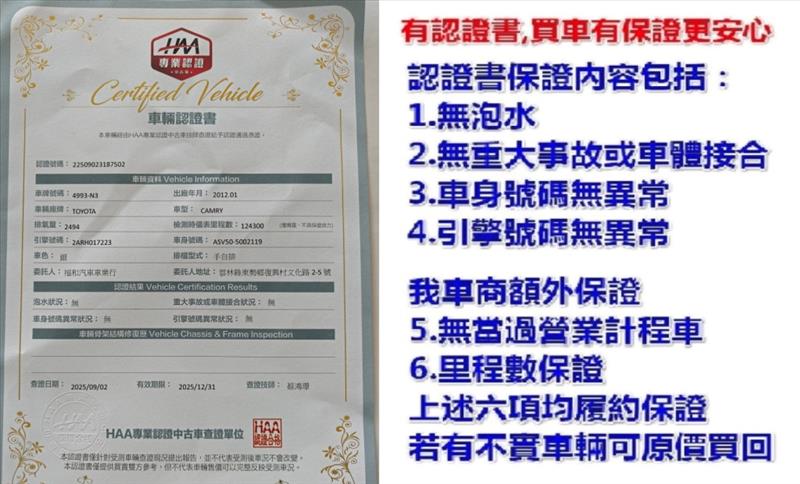 有認證書,履約以上六大保證,SAVE五大保固(保固最長兩年五萬公里).