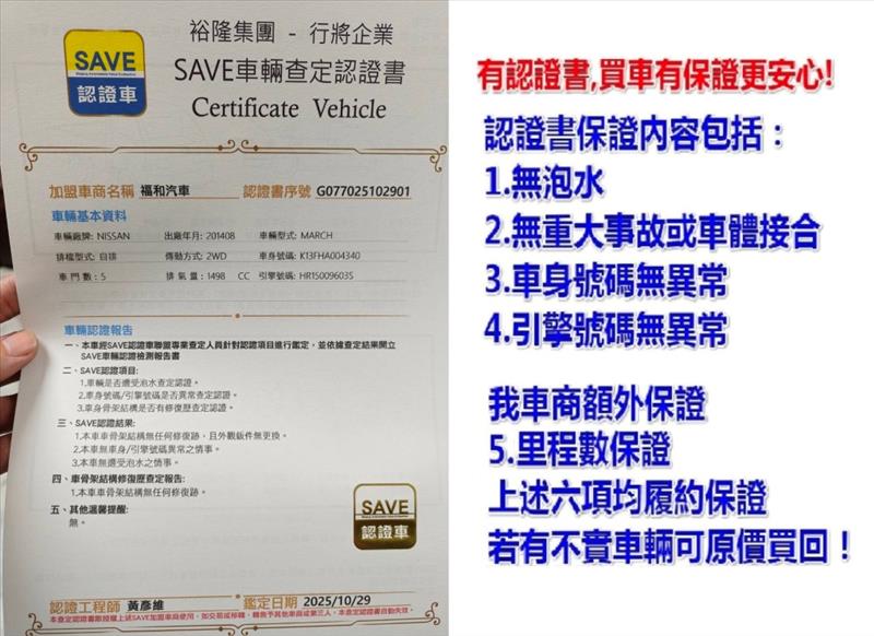 保證**2.無重大事故或車體接合3.無泡水4.車身號碼無異常5.引擎號碼無異常6.保證非計程車,以上均履約保證!(並附認證書)