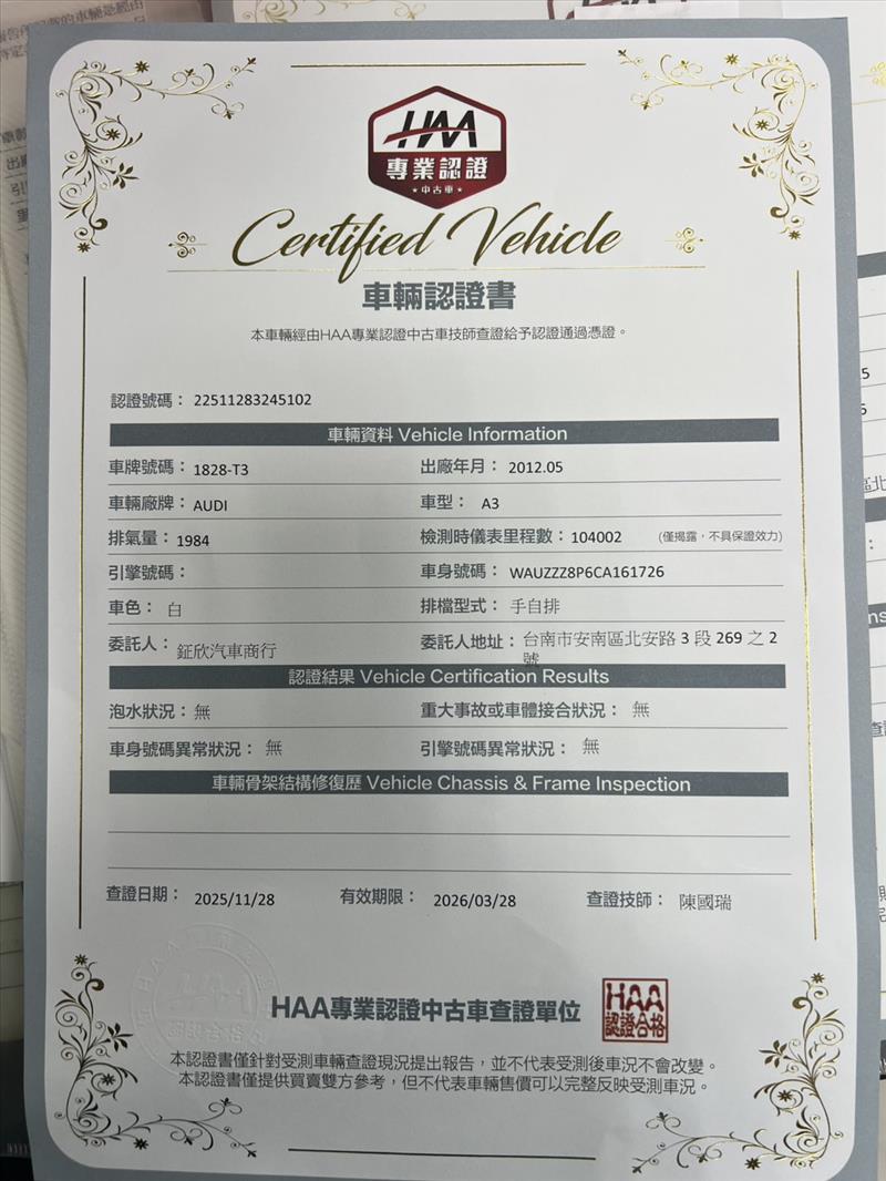 奧迪A3 2.0TFSI 原價176萬 附有第三方認證書