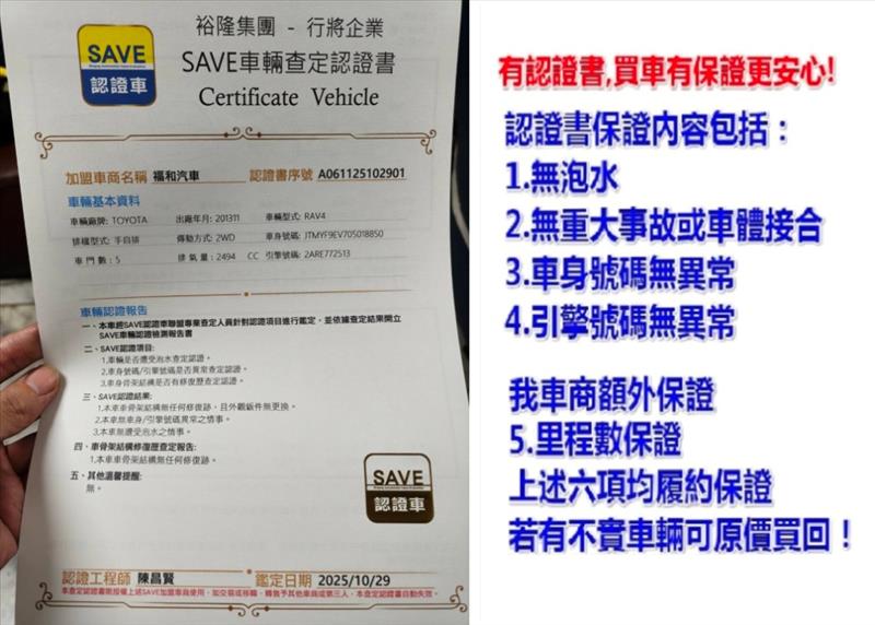 保證**1.里程數保證2.無重大事故或車體接合3.無泡水4.車身號碼無異常5.引擎號碼無異常6.保證非計程車,履約以上六大保證.
