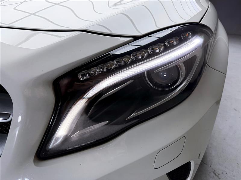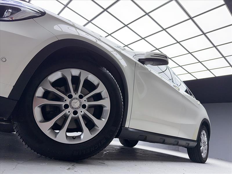 隨著引擎蓋的強壯隆起,與輪拱的玲瓏曲線往後領略,車側的肩腰線立體且寬闊,粗獷的越野側裙,讓GLA顯露出SUV強硬的風格,而流線雕塑的座艙設計,搭配全車系標配尾端刻意上揚的側窗下緣鍍鉻飾條及側身三條動感肌肉線條,則使硬漢般的GLA有著類似跑車輕快的感覺。車頂的鋁質行李架賦予了好動個性的最佳條件。緊接著,車尾的晶亮尾燈,同樣以LED科技點出重點,還透過下方大面積的車身護板,與車頭的下擾流相互呼應,並將左右雙出的矩形排氣尾管完美整合。